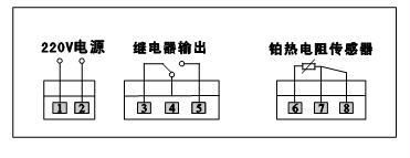 端口1、2接220V电源,端口3、4、5为继电器输出,其中端口3、4常闭,端口3、5常开,端口6、7、8接铂热电阻传感器。 |